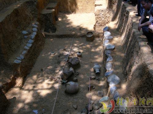 9月1日,从正在发掘的广西桂平大塘城遗址传来消息:该处发现一片汉代古墓群,目前已发掘7座,另外一座正在紧张发掘中。记者立即赶往桂平,在发掘现场看到刚刚出土的大量陶器、青铜器等随葬文物。
